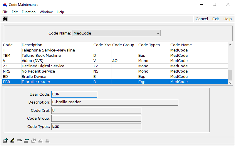 Description: The Code Maintenance window is set to display MedCode. The filled in fields are User Code: EBR, Description: E-braille reader, Code Xref: B, Code Types: Eqp.