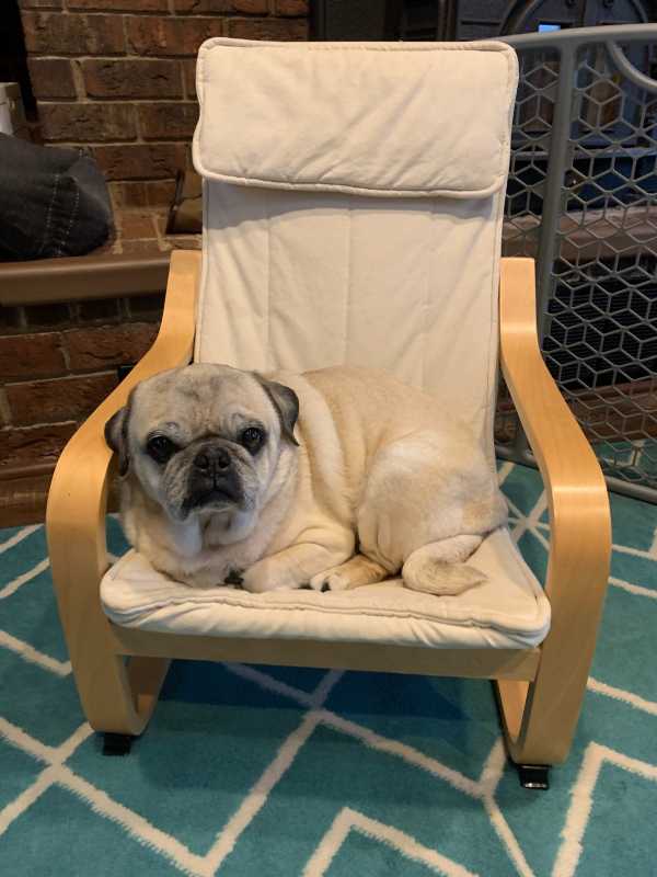 Description: An older pug is curled up in a small, beige children's IKEA chair.