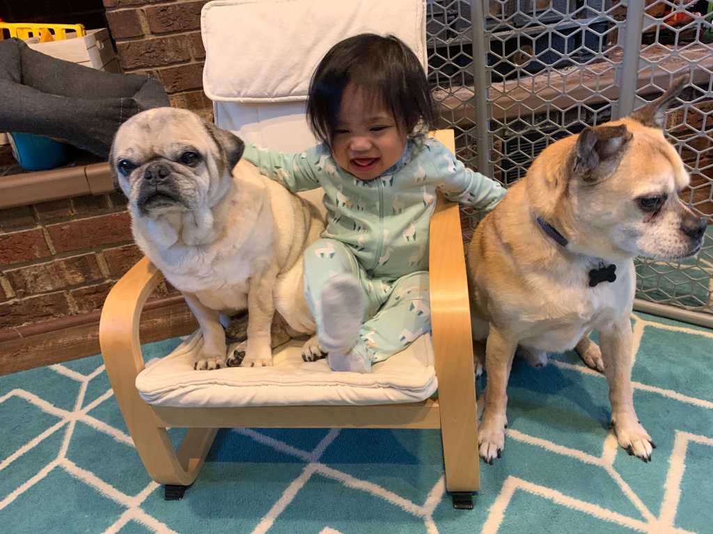 Description: Cora-Grace sits in a small, beige children's IKEA chair with an older pug curled up beside her and a puggle sitting on the floor beside the chair. She has one hand on each dog.