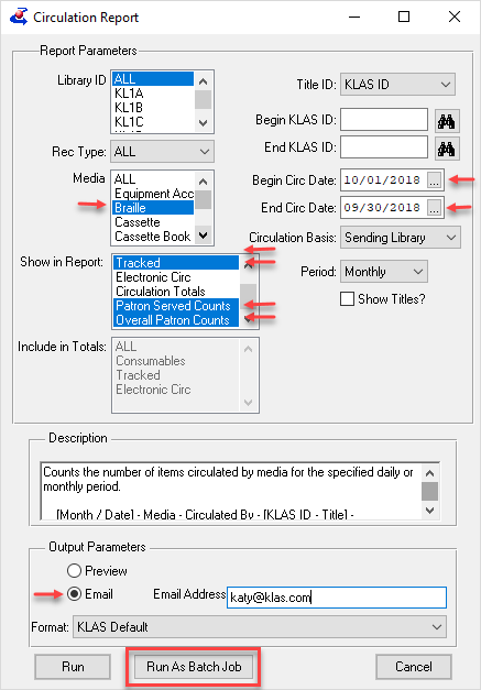 - Select "Run as Batch Job." The report will be emailed to the address included in the parameters.