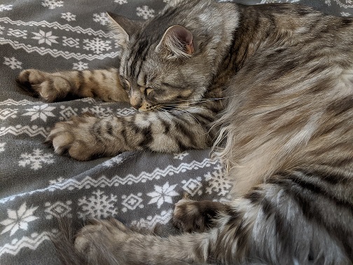 Description: A grey tabby cat sleeps on a blanket. He has big paws and an extra fluffy belly.