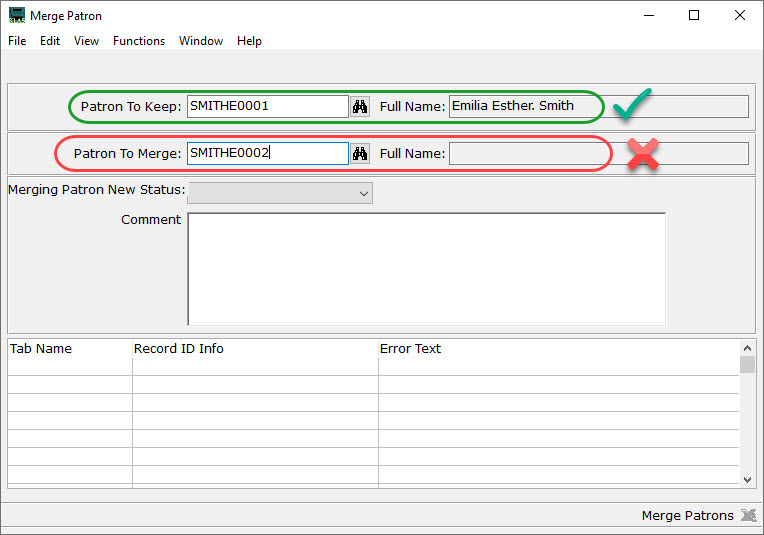 When using the Merge Patrons tool, or any other KLAS function with a KLAS ID field, Find button, and Name display field, make sure that the patron's Name fills in before applying changes!